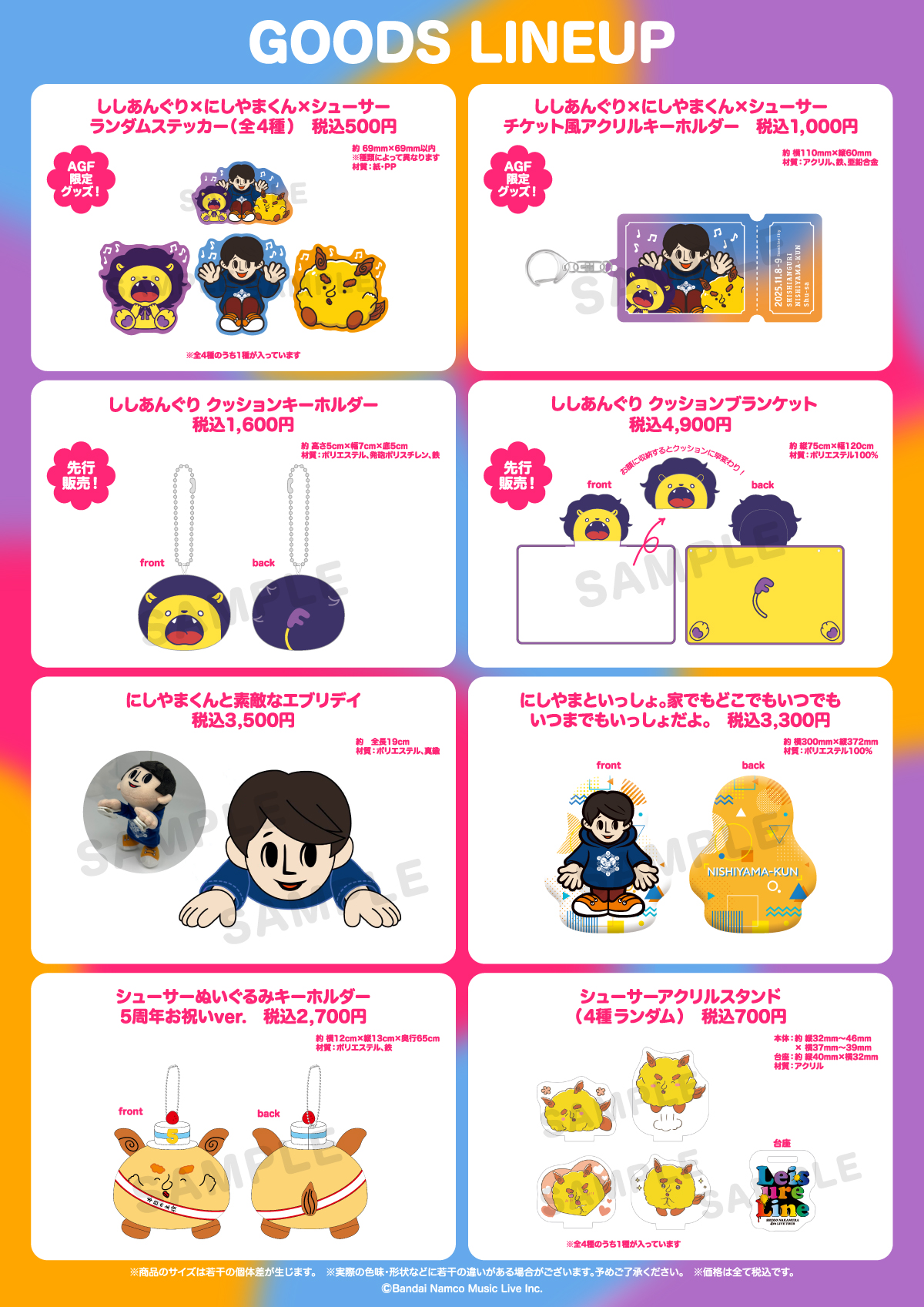 声優・西山宏太朗さんのアーティスト公式キャラクター「にしやまくん」、声優/シンガーソングライター・仲村宗悟さんの公式キャラクター「シューサー」とコラボレーションしたアニメイトガールズフェスティバル2025限定グッズや、ブランケット・クッションキーホルダーの新たなグッズも登場します!